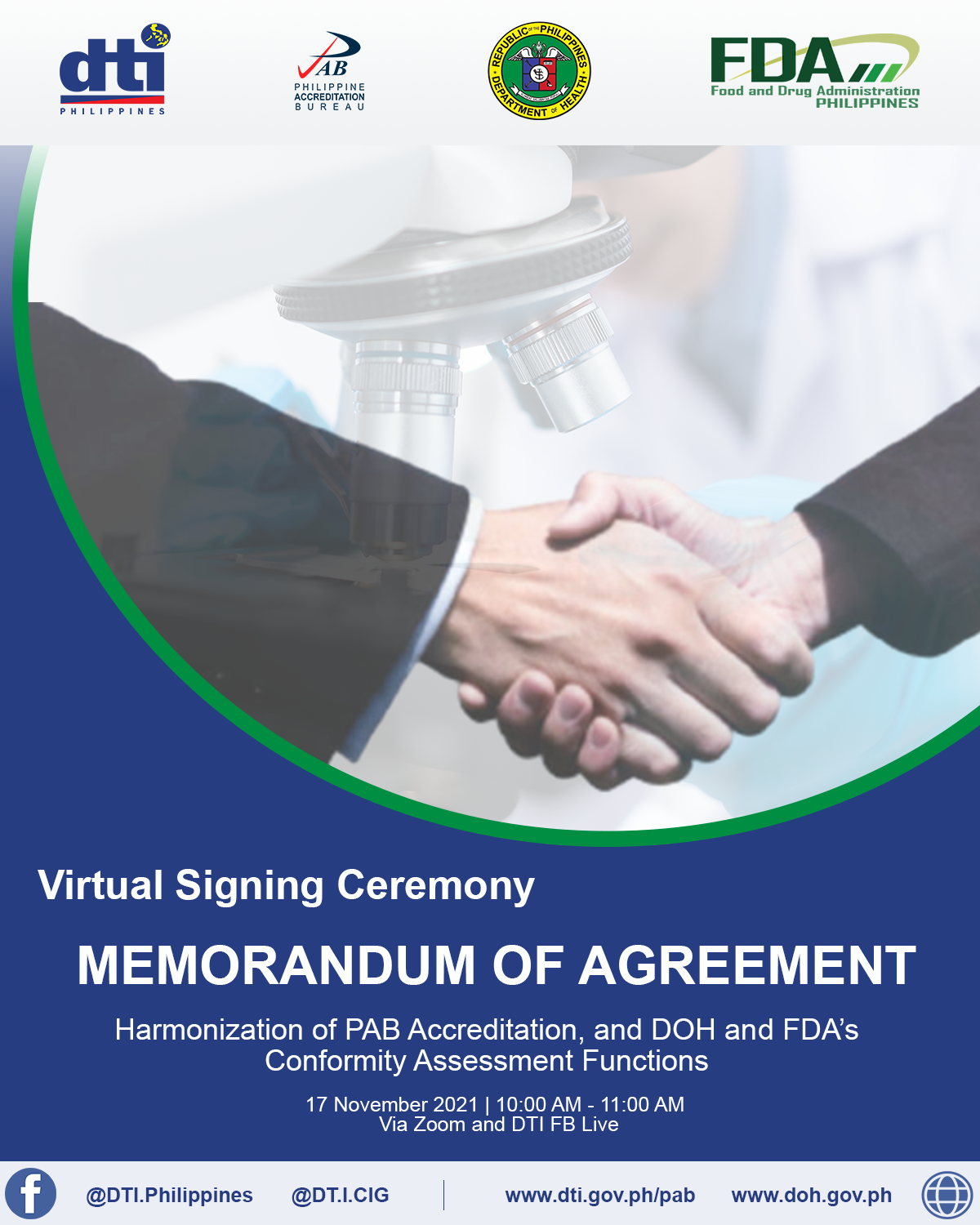 The Department of Trade and Industry – Philippine Accreditation Bureau (DTI-PAB) invites everyone to witness the virtual signing ceremony of its Memorandum of Agreement (MOA) with the Department of Health (DOH) and Food and Drug Administration (FDA) on 17 November 2021, 10:00 AM to 11:00 AM. The MoA is aimed at harmonizing accreditation and conformity assessment functions.