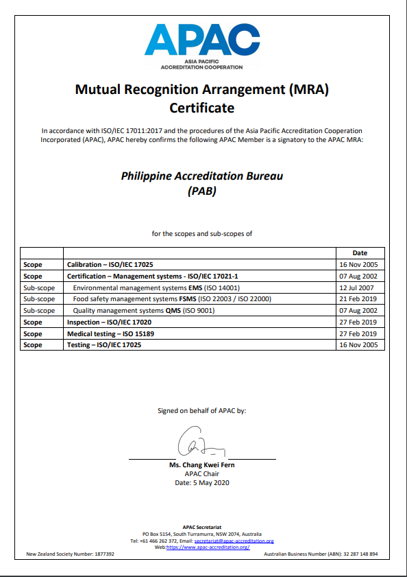 DTI-PAB first signed the Asia Pacific Accreditation Cooperation (APAC) (formerly Asia Pacific Laboratory Accreditation Cooperation and Pacific Accreditation Cooperation) Mutual Recognition Arrangement (MRA) for testing laboratories and calibration (ISO/IEC 17025) in 2005 and Multilateral Recognition Arrangement (MLA) for Quality Management System (QMS) and Environmental Management System) in 2002 and 2007 respectively. In 2019, the scopes of DTI-PAB’s APAC MRA signatory status was extended to its accreditation schemes for medical testing, inspection and food safety management system (FSMS) certification All accreditation schemes and scopes underwent actual peer evaluation on site except for accreditation to FSMS certification, which is a self-declaration. IAF issued a Resolution allowing ABs which are signatory to main scope i.e. ISO/IEC 17021 (Management System) to self-declare that their accreditation program under ISO/IEC 17021 (called subscope), e.g. FSMS complies with the requirements of APAC and IAF.