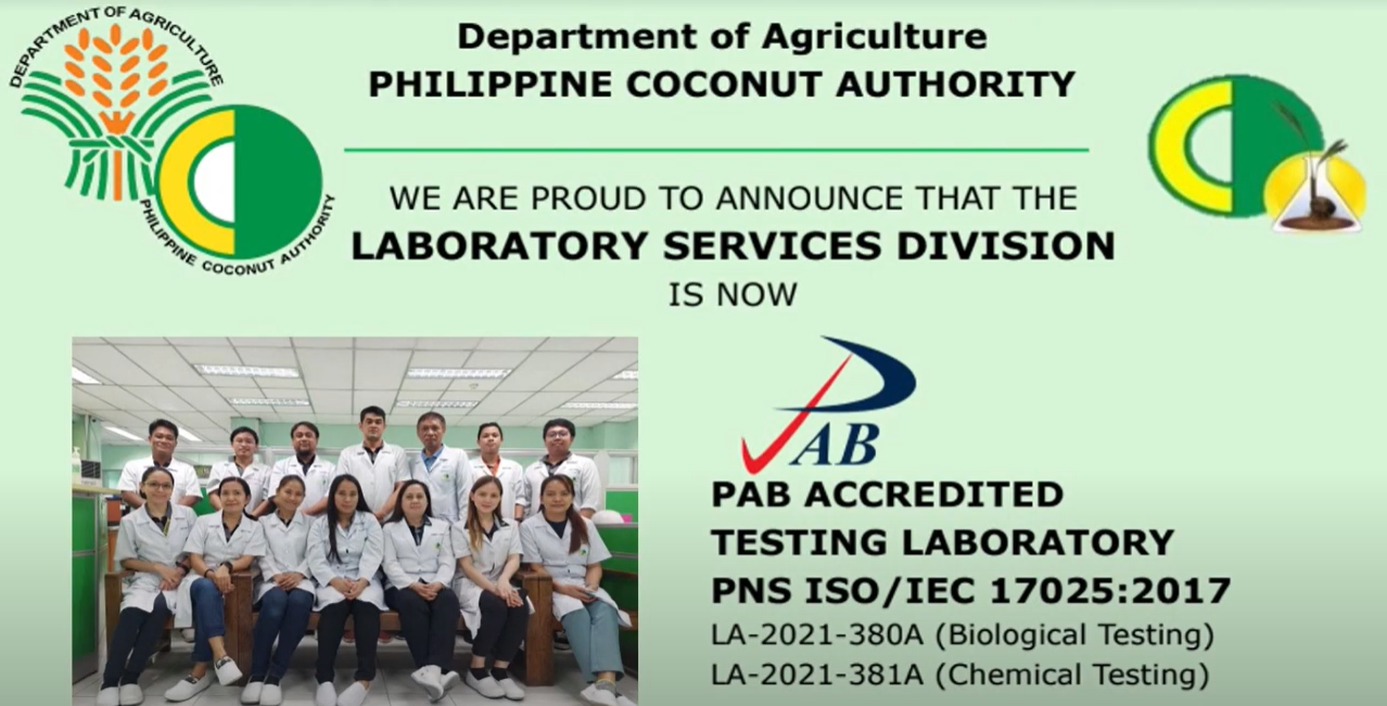 The COVID-19 pandemic did not deter the Philippine Coconut Authority – Laboratory Services Division (PCA-LSD) from obtaining its PNS ISO/IEC 17025:2017 accreditation in the fields of Biological and Chemical Testing from the Department of Trade and Industry – Philippine Accreditation Bureau (DTI-PAB).