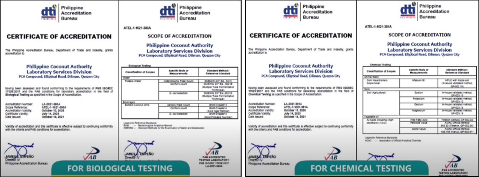 The accreditation of PCA-LSD is valid until October 13, 2026, subject to continuing conformity with the ISO technical requirements and PAB conditions for accreditation. Potable water and bottled coconut drink for beverages are the scopes covered for accreditation under the Biological Testing. Animal Feeds (Corn Meal/Kernels and Copra Meal), Soils (Agricultural) and Vegetable Oil, are among the accredited scopes for Chemical Testing.
