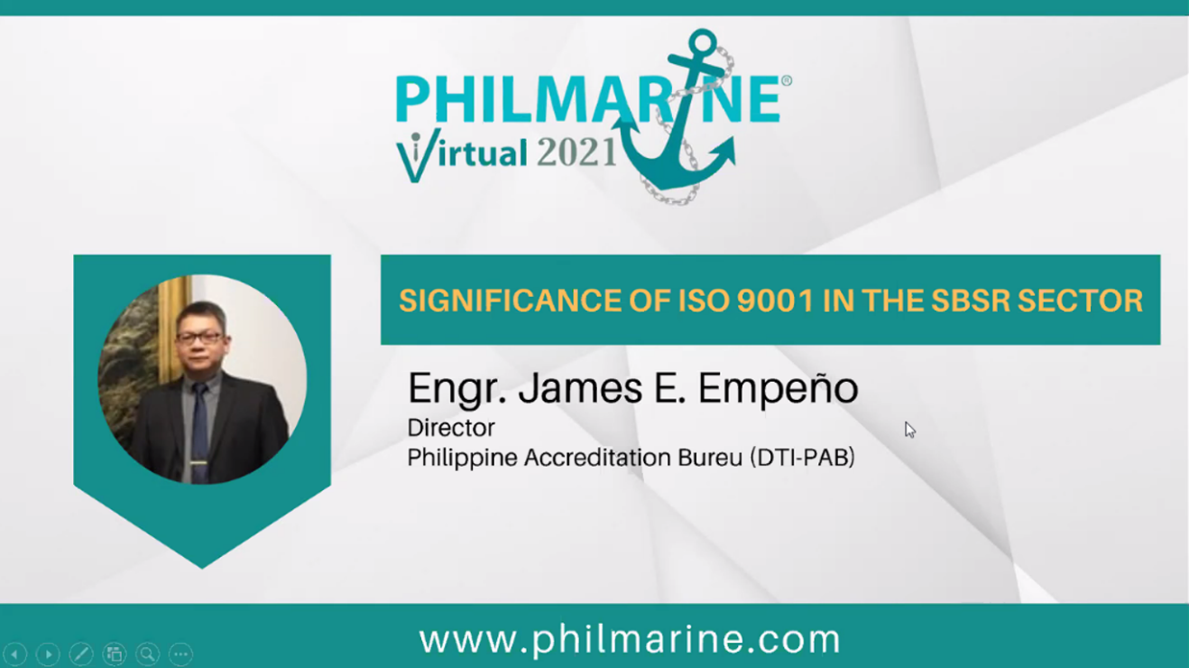 During the 7th Philippine Marine 2021 Virtual Expo’s SBSR Technical Conference, Dir. Empeño explains that ISO 9001 is a standard that sets out the requirements for a quality management system. It helps businesses and organizations to be highly efficient and more customer-focused.