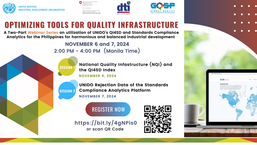 The Department of Trade and Industry (DTI) and the United Nations Industrial Development Organization (UNIDO), through the Global Quality and Standards Programme (GQSP) funded by the State Secretariat for Economic Affairs (SECO) of the Government of Switzerland, are pleased to invite you to a two-part webinar series titled “Optimizing Tools for Quality Infrastructure” on November 6 and 7, 2024.