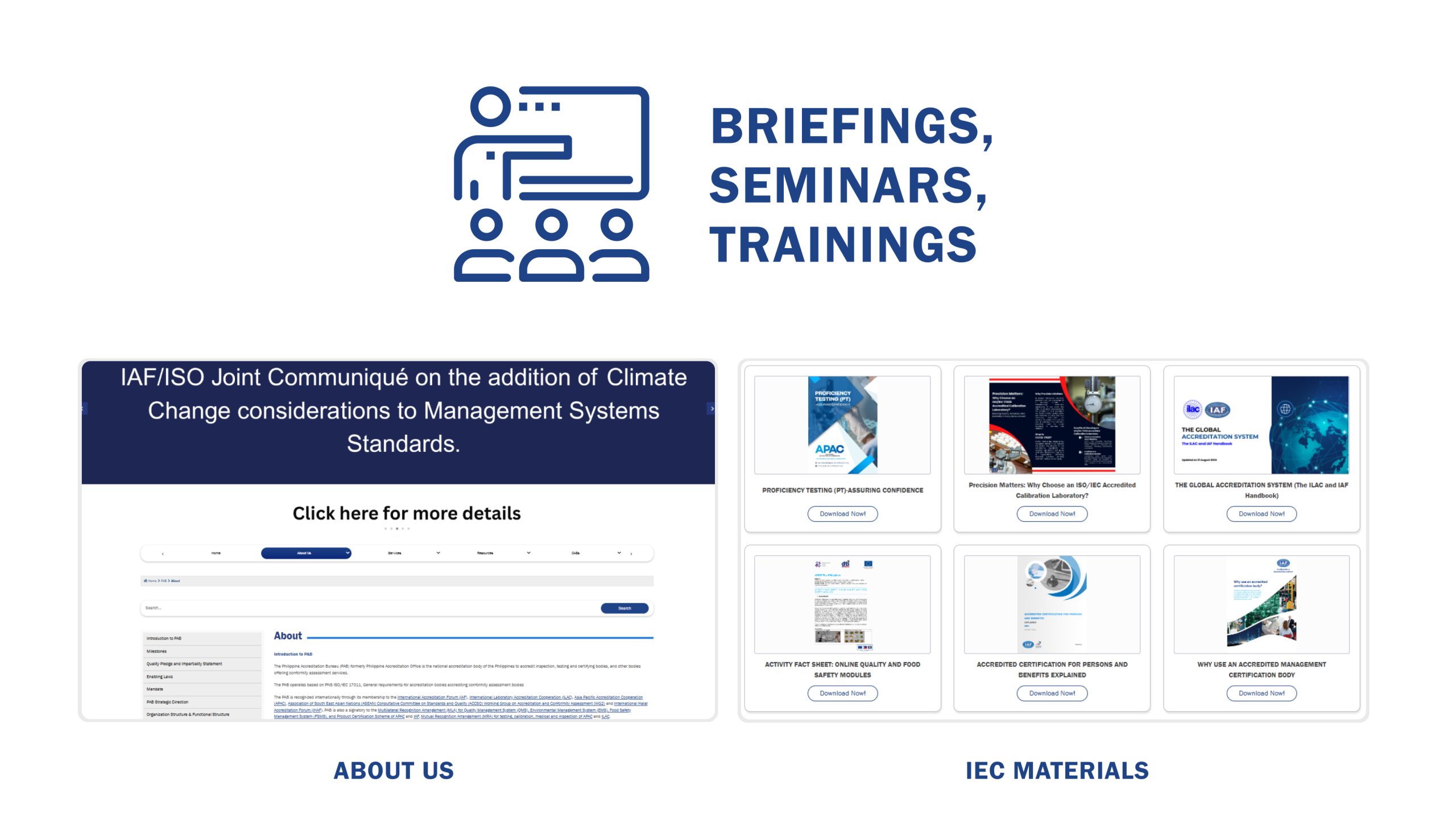 The Promotion and Documentation (PD) Division promotes accreditation activities; extend technical assistance to trade and industry sectors through training programs; conduct training for assessors to strengthen their capability to do assessment work; make information on accreditation schemes available to institutions, organizations, business and individuals concerned; and ensure that all information from the different regional and international fora processed, disseminated and acted upon.