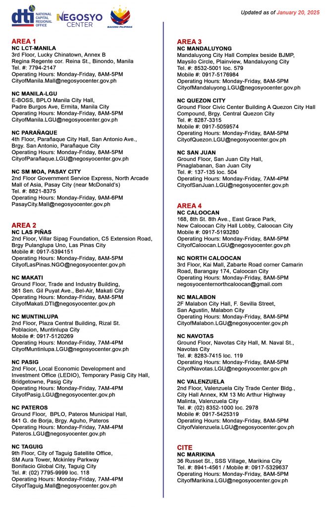 It has five (5) Area Offices that are mandated to monitor and assess trade performance in Area 1 (Manila, Parañaque, Pasay), Area 2 (Pasig, Taguig, Pateros, Las Piñas, Makati, Muntinlupa), Area 3 (Quezon City, Mandaluyong, San Juan), Area 4 (Caloocan, Malabon, Navotas, Valenzuela), and CITE (Marikina).