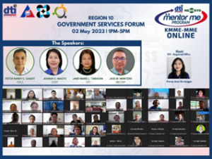 May 12, 2023NORTHERN MINDANAO — Fifty-six mentees of Department of Trade and Industry (DTI) Region 10’s Kapatid Mentor ME-Money Market Encounter (KMME) 2023 Batch 1 attend the virtual Government Services Forum. The Government Services Forum was conducted for mentees to know more about the programs and services of different government agencies...Read More -