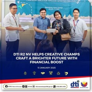 May 28, 2025Bayombong, Nueva Vizcaya — In a significant move to empower local creatives affected by Super Typhoon Pepito, the Department of Trade and Industry (DTI) Region 2 Nueva Vizcaya Provincial Office awarded financial assistance to 40 Micro, Small, and Medium Enterprises (MSMEs) under the creative industry on 13 January 2025. The…Read More