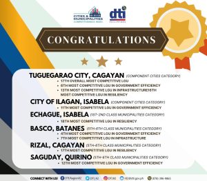 February 04, 2022Two cities and four municipalities in Cagayan Valley made it to the Top 20 in the recently concluded 2021 Cities and Municipalities Competitiveness Index (CMCI) Survey that was participated in by around 1,600 Local Government Units all over the Philippines. For the Component Cities category, Tuguegarao City and the City…Read More -