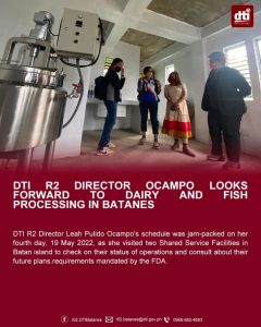 June 02, 2022DTI R2 Director Leah Pulido Ocampo’s schedule was jam-packed, 19 May 2022, as she visited two Shared Service Facilities (SSF) on Batan Island to check on their status of operations and consult about their future plans. RD Ocampo’s first stop was at the Dairy Processing Facility—a collaboration project with the…Read More -