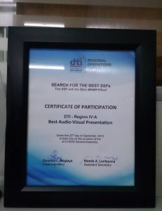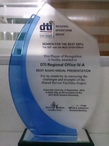 DTI CALABARZON was the very first recipient of the Best Audio-Visual Presentation, one of the two major awards during the 2015 Search for the Best SSFs: The SSF with the Most Ramdam Effect held at 2015 DTI Regional Operations Group General Assembly in Iloilo City.