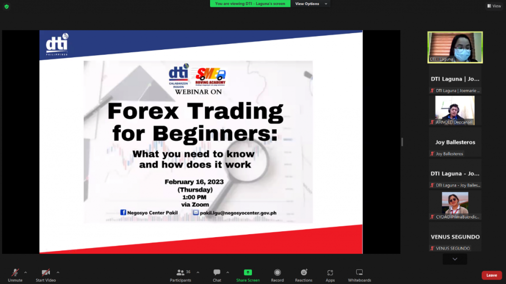 PAKIL, LAGUNA — The Department of Trade and Industry – Laguna Provincial Office (DTI-Laguna), through its Negosyo Center Pakil, conducted a webinar on Forex Trading for Beginners: What You Need to Know and How Does It Work last 16 February 2023 via the online conferencing platform Zoom. The 2-hour webinar session was attended by eighty-four (84) participants from Pakil and nearby towns. The webinar was discussed by a #BITS graduate and Forex Trader, Mr. Argel Carl Platon.