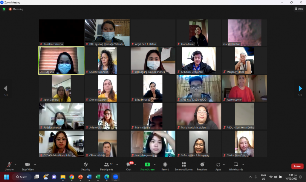 The aforementioned webinar received positive comments from the participants, and they expressed their satisfaction to the learning activity. Moreover, they are pleased and are interested to join future free webinars offered by DTI-Laguna. Two more webinars of DTI-Laguna are scheduled for implementation this coming February 2023: How to Get Customers to Love You (Branding and Social Media Marketing) to be hosted by Negosyo Center Siniloan on 22 February 2023 and Seminar on How to Start a Business cum Digitalization through Google My Business on 22 to 23 February 2023 to be hosted by Negosyo Center Kalayaan in partnership with the Local Government Unit of Kalayaan. ♦