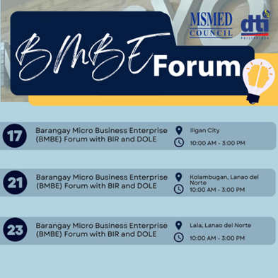 The BMBE Forum will be held on February 17 in Iligan City; February 21 in Kolambugan, Lanao del Norte; and February 23 in Lala, Lanao del Norte.