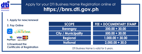 As part of its effort to deliver an efficient government service, DTI business name can now be applied online at www.bnrs.dti.gov.ph. Online payment options are also available through GCassh, Land Bank of the Philippines Link.BizPortal, PayMaya, debit, or credit. ♦